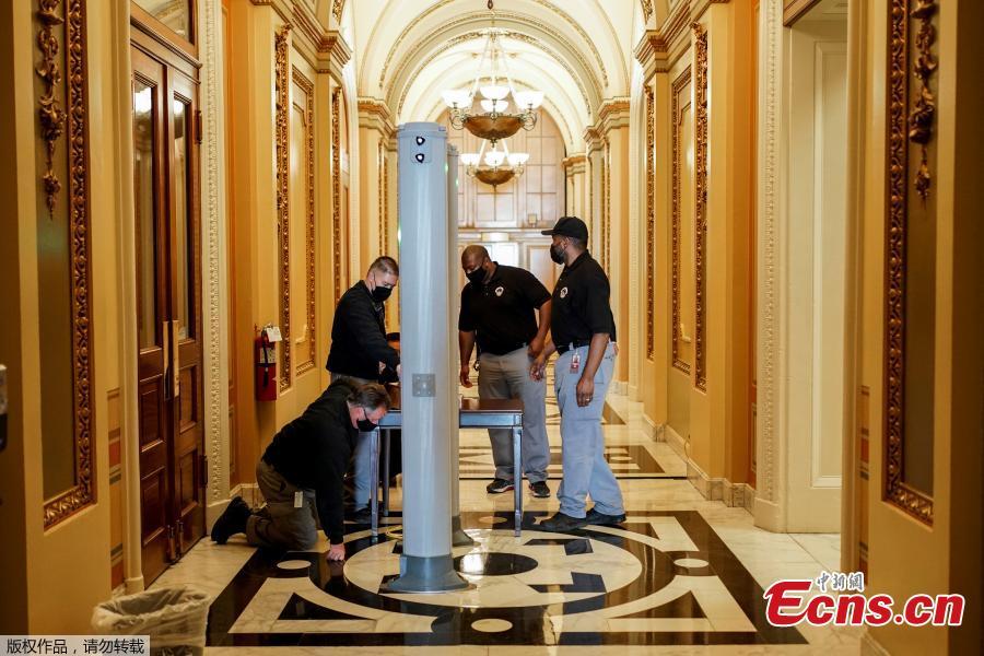 Security personnel set up a metal detector in front of an entrance to the House Chamber on Capitol Hill in Washington, U.S., Jan. 12, 2021. (Photo/Agencies)