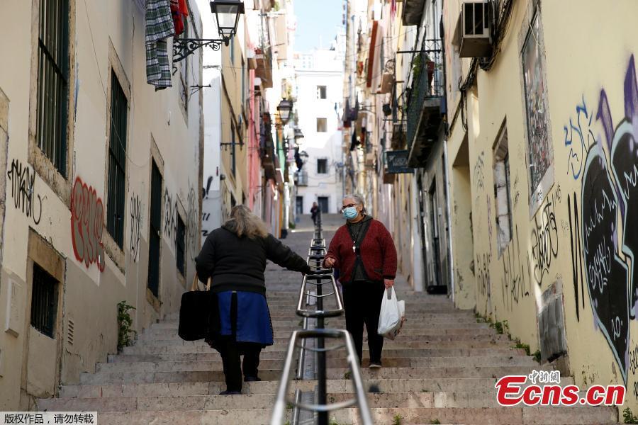 A painter with mask sits on the street in the Alfama Community in Lisbon, Portugal, Jan. 13, 2021. (Photo/Agencies)