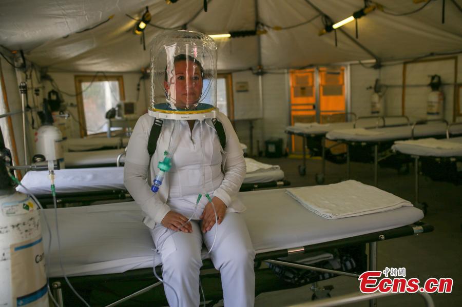 A local hospital medical worker tests a transparent helmet-like oxygen mask used for severe patients infected with novel coronavirus, in Bogota, Colombia, Jan. 18, 2021. (Photo/VCG)