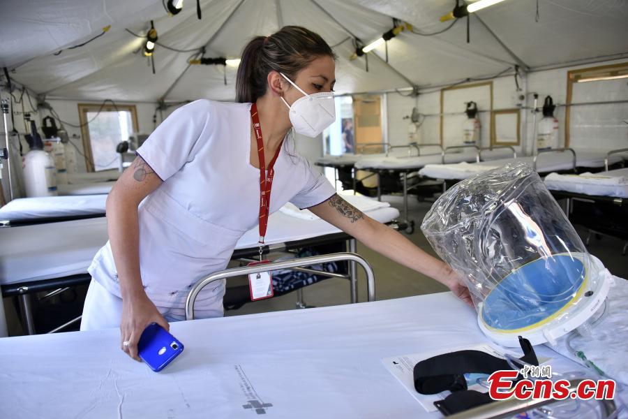 A local hospital medical worker tests a transparent helmet-like oxygen mask used for severe patients infected with novel coronavirus, in Bogota, Colombia on Jan. 18, 2021. (Photo/VCG)