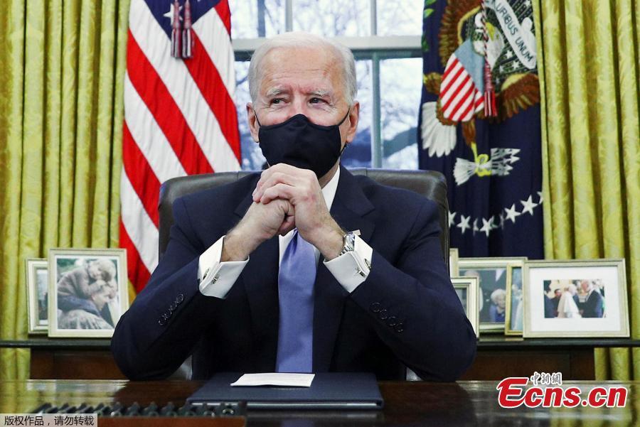 U.S. President Joe Biden signs executive orders in the Oval Office of the White House in Washington, after his inauguration as the 46th President of the United States, U.S., Jan. 20, 2021. (Photo/Agencies)