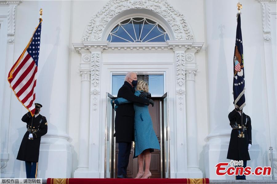 U.S. President Joe Biden and first lady Jill Biden hug as they arrive at the North Portico of the White House in Washington, DC, U.S., Jan. 20, 2021. (Photo/Agencies)