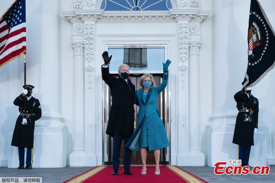 U.S. President Joe Biden and first lady Jill Biden wave as they arrive at the North Portico of the White House in Washington, DC, U.S., Jan. 20, 2021. (Photo/Agencies)