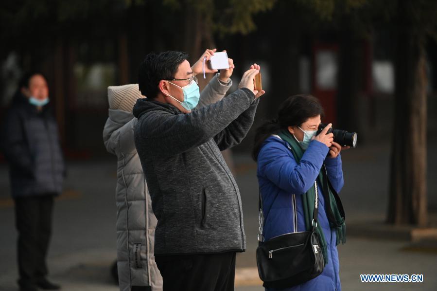 Tourists take photos during sunset at the Summer Palace in Beijing, capital of China, Jan. 21, 2021. (Photo by Hu Zhixuan/Xinhua)