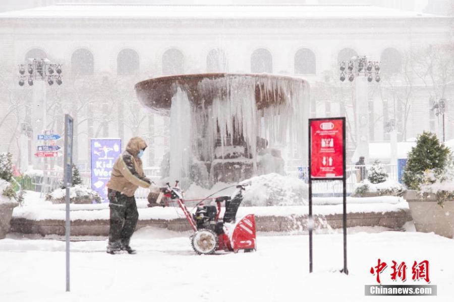 A person removes snow from the sidewalk in New York City, U.S., Feb. 1, 2021. New York State declared a state of emergency in New York City, Long Island and seven counties in Hudson Valley on Monday as a heavy snowstorm has been hitting the areas hard from Sunday night. (Photo/China News Service)