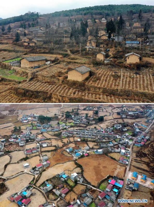 In this combo photo taken on Jan. 21, 2021, the upper part shows an old village where Bamu Yubumu used to live; the lower part shows Taoyuan Village where Bamu Yubumu lives now in Yuexi County, Liangshan Yi Autonomous Prefecture, southwest China's Sichuan Province. A young mother leaned arduously forward to balance the weight of an oversized luggage on her back and a tiny baby in her arm, as she fought her steps ahead. This was the image that Xinhua reporter Zhou Ke captured near the Nanchang Railway Station in Nanchang, east China's Jiangxi Province, Jan. 30, 2010. The photo entitled "Baby, Mom Takes You Home" touched the hearts of millions when it made headline on hundreds of media across the country. No one, however, was able to identify this brave and perseverant mother until Zhou Ke managed to locate her after 11 years of unremitting quest. Bamu Yubumu, now 32 and a mother of four children, is a resident in Taoyuan Village, Yuexi County, Liangshan Yi Autonomous Prefecture, southwest China's Sichuan Province. She and her family used to live in an obsolete house with leaking roof at a village of barren lands, and had to work as hard laborers along with her husband away from her hometown to make both ends meet. The only connection between Taoyuan Village and the outer world then was a muddy trail. Bamu recalled that most babies were born at home, and quite a few of them failed to get cure in time when they fell ill. The baby, Bamu's second daughter who was pictured in Bamu's arm in 2010, was ill then, and deceased five months later. The Bamu's became an officially registered household in poverty in 2014, and later Bamu and her husband started to learn tobacco planting. The couple saw their produces doubled in a few years with annual income swelling by nearly 10 times. The family built their new residence in 2019, and saw the annual income hitting 100,000 yuan (about 15,500 U.S. dollars) in 2020, shaking off poverty from then on. Since 2013, Bamu has given birth to another three children. All the babies were born at the county hospital free of charge. Her first daughter Wuqi Labumu is now in junior high school, her second daughter in primary school, and her first son in kindergarten. (Xinhua/Li Sijia)