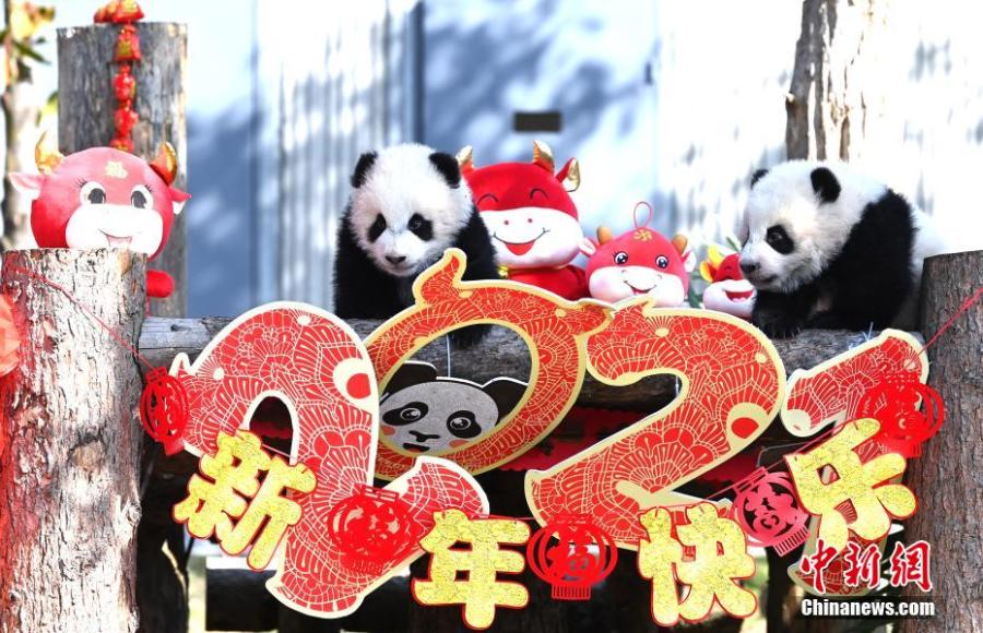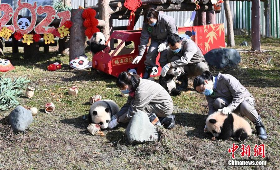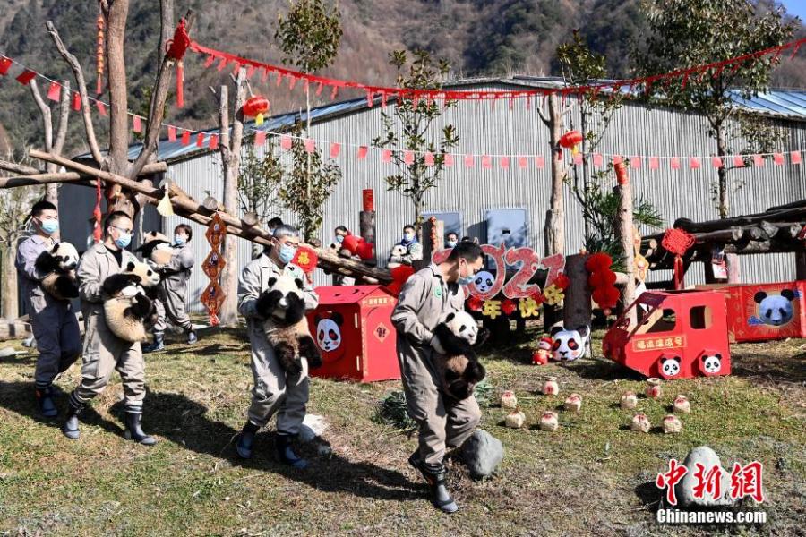 Ten panda cubs born last year meet the public at Shenshuping base of China Conservation and Research Center for Giant Pandas in Wolong National Nature Reserve, southwest China's Sichuan Province, Feb. 3, 2021. (Photo/China News Service)