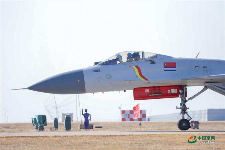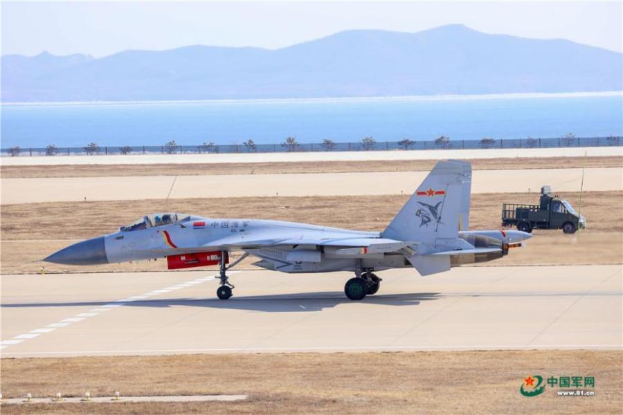 A fighter jet attached to the PLA Naval Aviation University taxies on the runway during a flight training course on Jan. 28, 2021. (Photo/eng.chinamil.com.cn)
