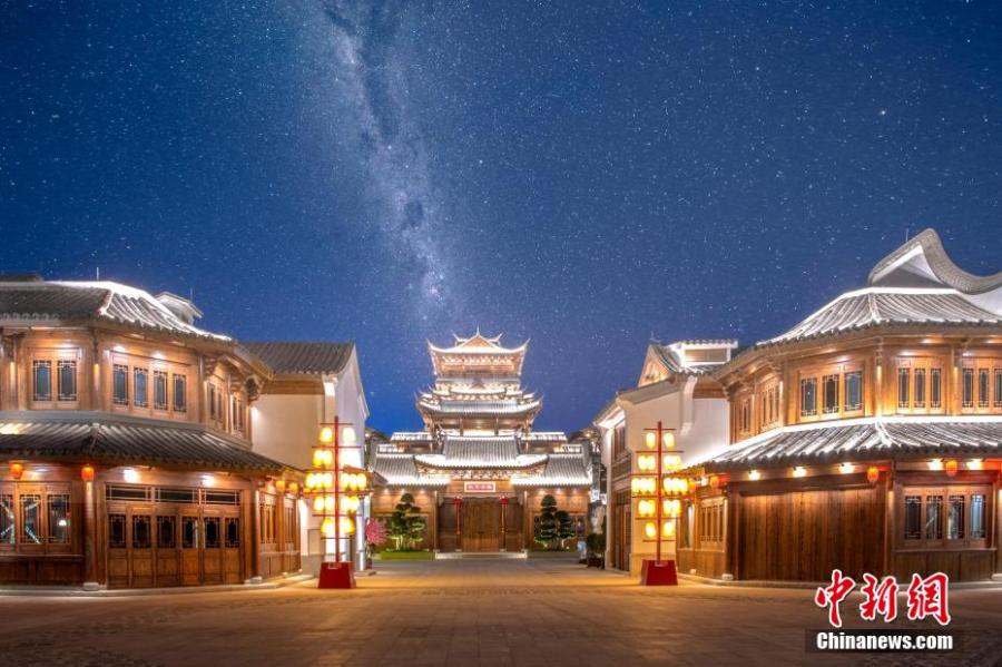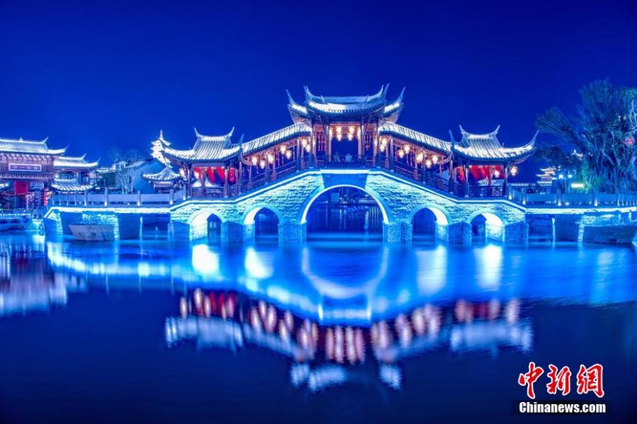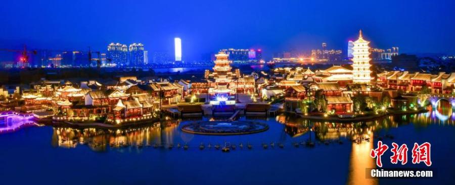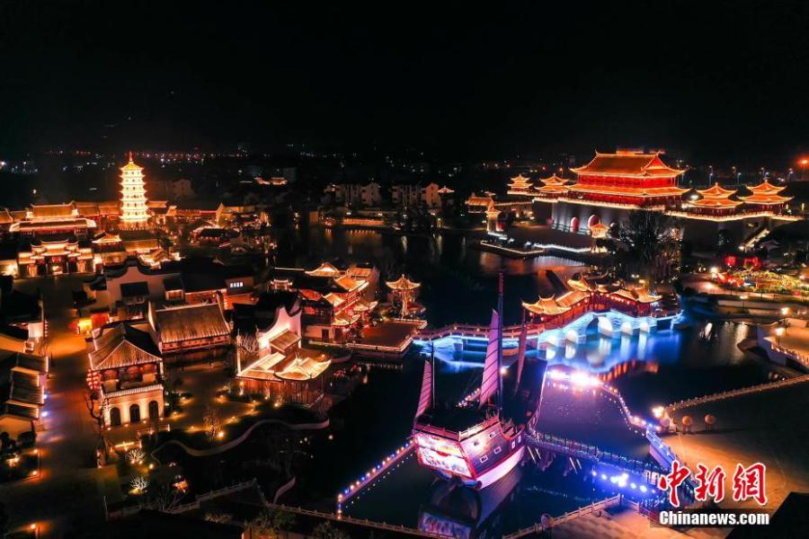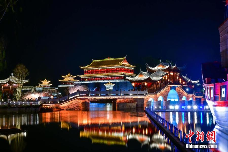 Photo shows the sparkling night view of Minyue water twon in Fuzhou, southeast China's Fujian Province. The Chinese New Year decorations light up the night, making it one of the most alluring attractions during the holiday. (Photo/China News Service)