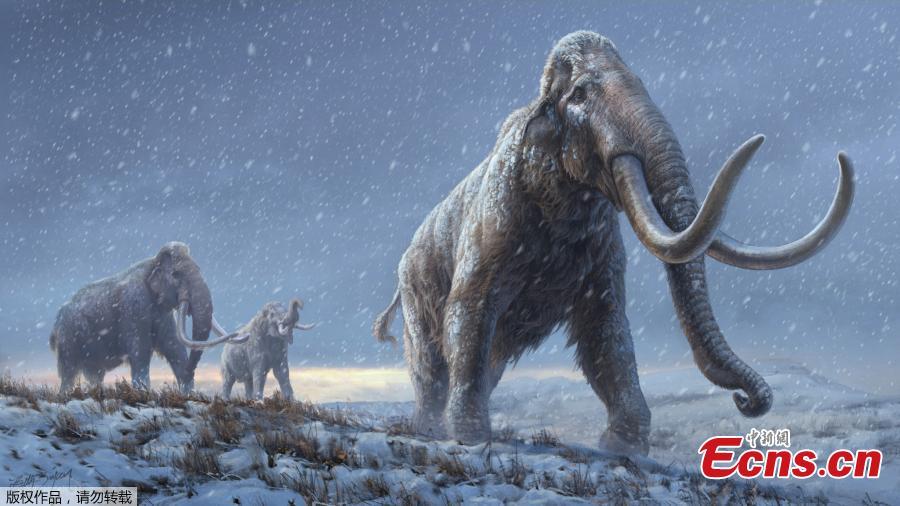 This handout illustration obtained on February 17, 2021 by Nature magazine, represents a reconstruction of the steppe mammoths that preceded the woolly mammoth, based on the genetic knowledge we now have from the Adycha mammoth. Researchers said the three specimens, one roughly 800,000 years old and two over a million years old, provide important insights into the giant Ice Age mammals, including the ancient heritage of the woolly mammoth. (Photo/Agencies)