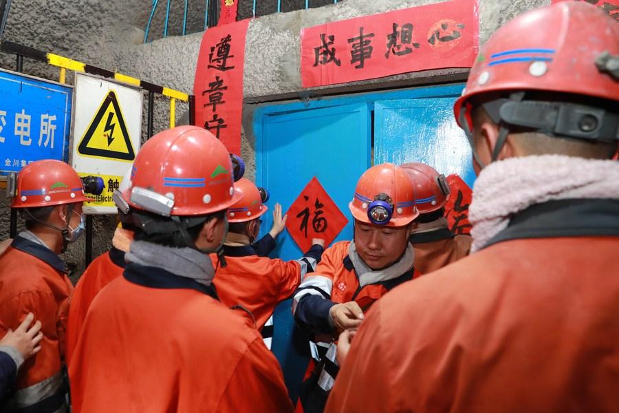 Miners paste festive decorations at the third mining zone of the Jinchuan Group in Jinchang, northwest China's Gansu Province, Feb. 11, 2021. (Xinhua/Du Zheyu)