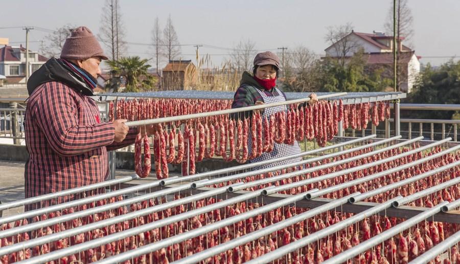 Villagers air-dry Lunar New Year sausages in Dagong Township, Hai'an City, Nantong, east China's Jiangsu Province, Jan. 10, 2021. (Photo by Xiang Zhonglin/Xinhua)
