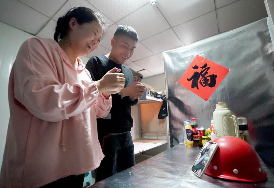 Volunteers take photos for workers who stay locally for the Chinese New Year in southwest China's Chongqing, Feb. 10, 2021. (Xinhua/Qin Tingfu)