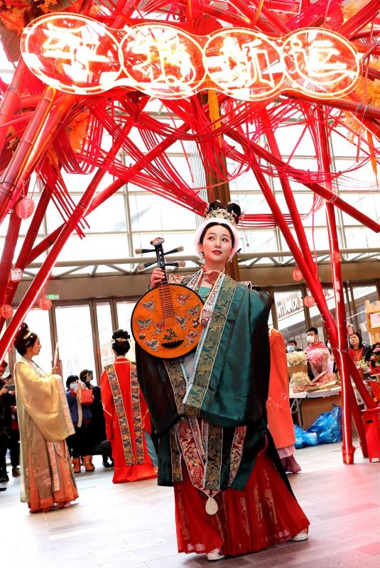 A performer presents traditional clothes at a shopping mall in east China's Shanghai, Feb. 12, 2021. (Xinhua/Chen Fei)