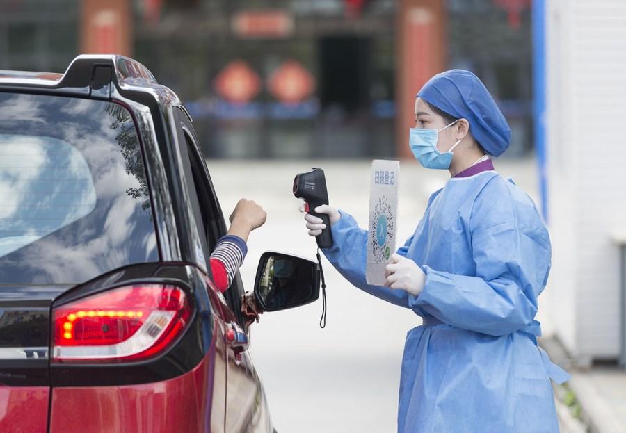 A medical worker measures the body temperature of a citizen in Liuzhou, south China's Guangxi Zhuang Autonomous Region, Feb. 11, 2021. (Xinhua/Huang Xiaobang)