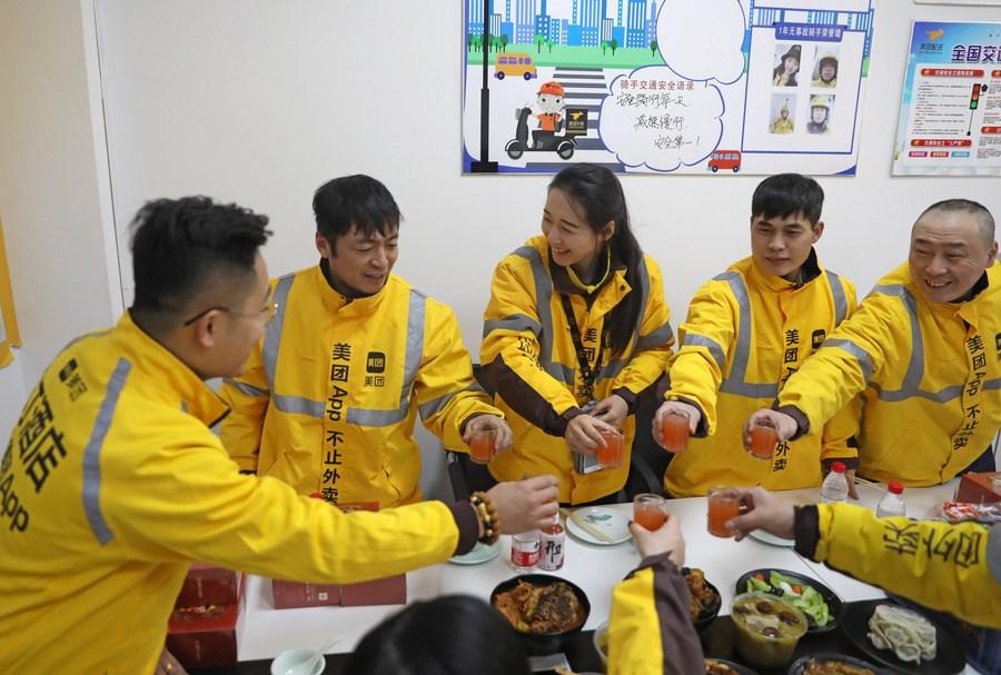 Delivery men and women have meal to celebrate the Chinese New Year in Shenyang, northeast China's Liaoning Province, Feb. 10, 2021. (Xinhua/Yang Qing)
