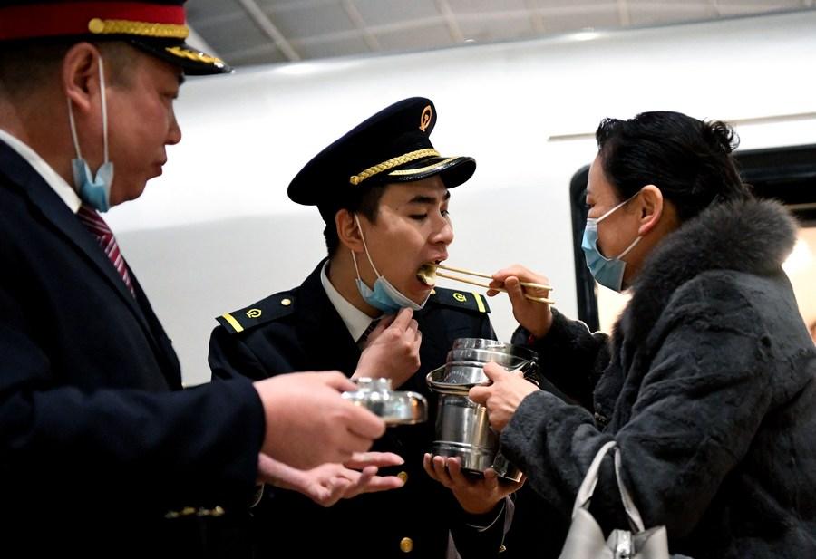 Guo Yushuo (C) eats dumplings made by his mother Hao Manling (R) on the platform in Wuhan Railway Station in Wuhan, central China's Hubei Province, Feb. 11, 2021. (Xinhua/Li An)