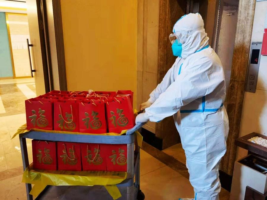 A staff brings Chinese New Year snacks to people who live at a quarantine spot in Shenyang ,northeast China's Liaoning Province, Feb. 11, 2021. (Xinhua/Yang Qing)
