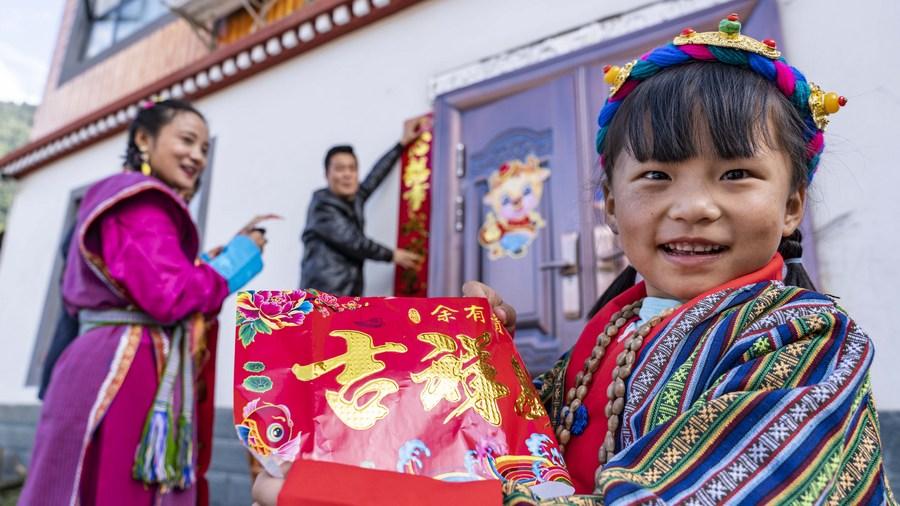 Zhang Chunhuan and his family members paste couplets on the eve of the Chinese Lunar New Year in Medog, southwest China's Tibet Autonomous Region, Feb. 11, 2021. (Xinhua/Sun Fei)