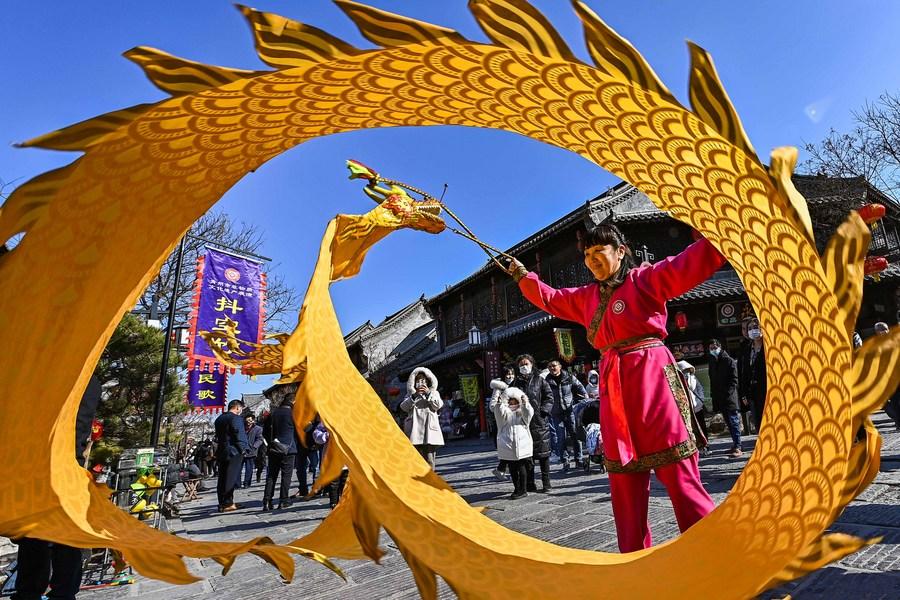 An artist performs at Qingzhou ancient town scenic area in east China's Shandong Province, Feb. 16, 2021. (Photo by Wang Jilin/Xinhua)