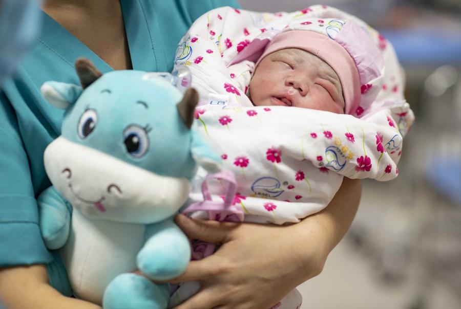 A baby born in the Year of the Ox is held by a health care worker at the maternity ward of Urumqi Maternal and Child Health Hospital in Urumqi, northwest China's Xinjiang Uygur Autonomous Region, Feb. 12, 2021. (Xinhua/Hu Huhu