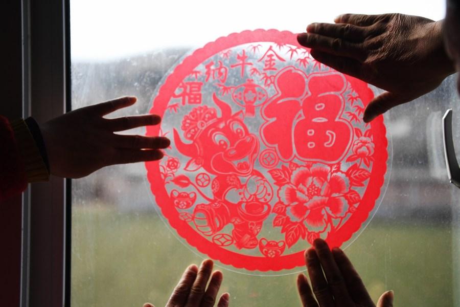 Villagers put paper-cuts on the window at their new home to welcome the first Chinese New Year after they shook off poverty in Pingliang, northwest China's Gansu Province, Feb. 3, 2021. (Xinhua/Chen Bin)