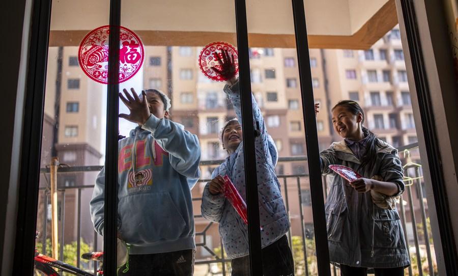 Family members put paper-cuts on the window at their new home to welcome the first Chinese New Year after they shook off poverty in Huize County of Qujing, southwest China's Yunnan Province, Feb. 11, 2021. (Xinhua/Jiang Wenyao)