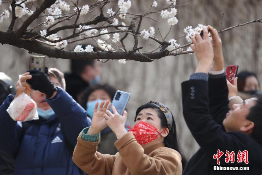 Photo taken on Feb. 18 shows citizens take photos under a renowned cherry tree near the Jiming Temple in Nanjing, Jiangsu.