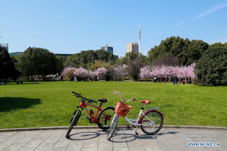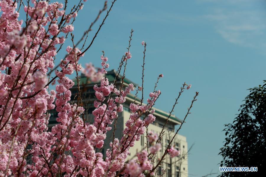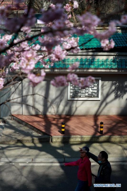Photo taken on Feb. 19, 2021 shows cherry blossoms at Wuhan University in Wuhan, capital of central China's Hubei Province. (Photo by Li Haigui/Xinhua)