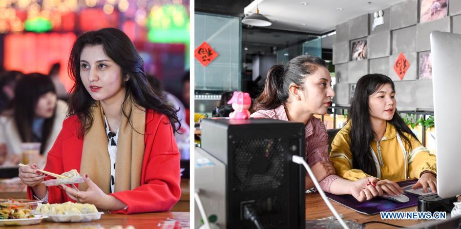Combo photo shows Nikal Nijat, a food vlogger, tasting dumplings on March 3, 2019 (L) and discussing with her team member about the editing plan of a food video on March 6, 2019 (R) in northwest China's Xinjiang Uygur Autonomous Region. Xinjiang's economy expanded 3.4 percent year on year in 2020, 1.1 percentage points higher than the national economic growth, according to the local government work report. With new access to opportunities in education and employment, people in Xinjiang are building a new tomorrow for a better life for themselves with the passage of time. (Xinhua/Hu Huhu)