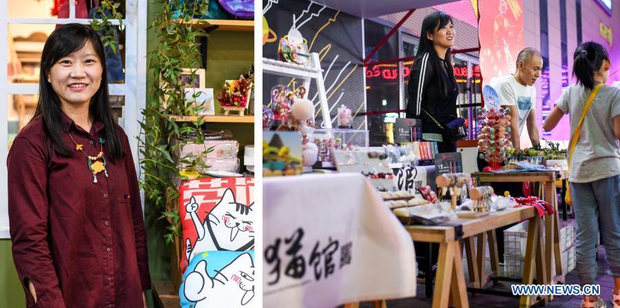 Combo photo shows Wang Lin, a famous internet emoji artist and the founder of "Cat House" cultural and creative platform posing for a photo in a Cat House on May 11, 2020 (L) and working at a night market on July 26, 2019 (R) in Urumqi, northwest China's Xinjiang Uygur Autonomous Region. Xinjiang's economy expanded 3.4 percent year on year in 2020, 1.1 percentage points higher than the national economic growth, according to the local government work report. With new access to opportunities in education and employment, people in Xinjiang are building a new tomorrow for a better life for themselves with the passage of time. (Xinhua/Wang Fei)