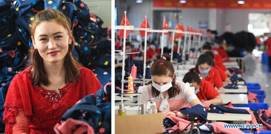 Combo photo shows Rushengul Usmann working at a garment factory, which providing over 100 jobs for local villagers, on May 23, 2020 (L) and on May 21, 2020 (R) in Shache County of Kaxgar, northwest China's Xinjiang Uygur Autonomous Region. Xinjiang's economy expanded 3.4 percent year on year in 2020, 1.1 percentage points higher than the national economic growth, according to the local government work report. With new access to opportunities in education and employment, people in Xinjiang are building a new tomorrow for a better life for themselves with the passage of time. (Xinhua/Wang Fei)