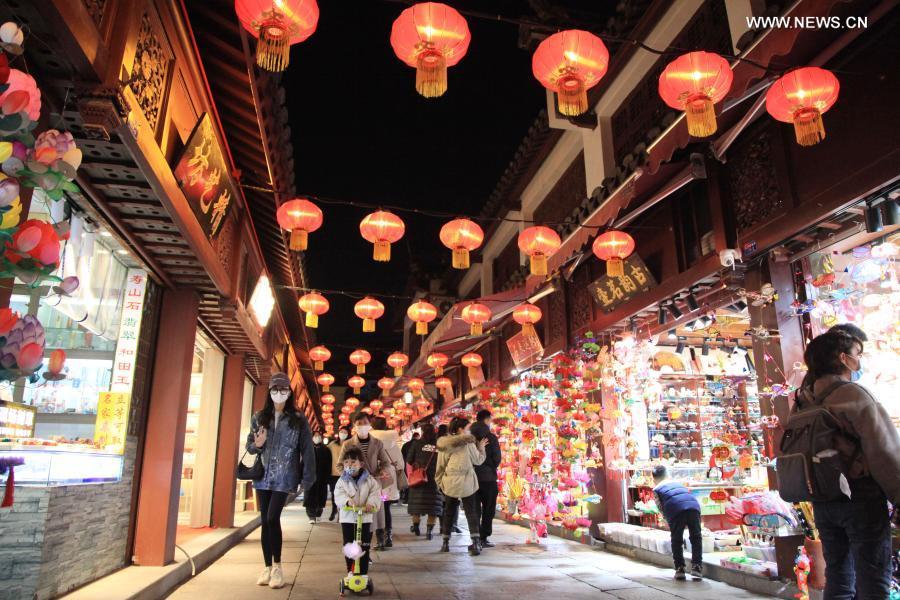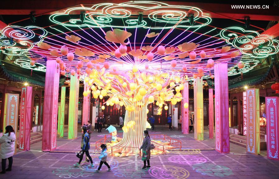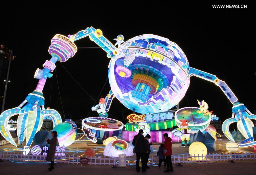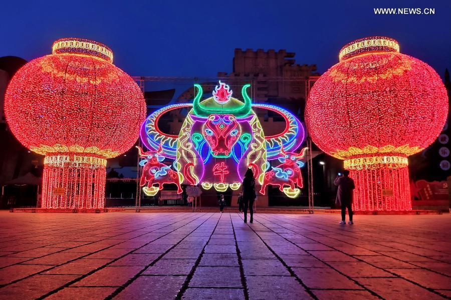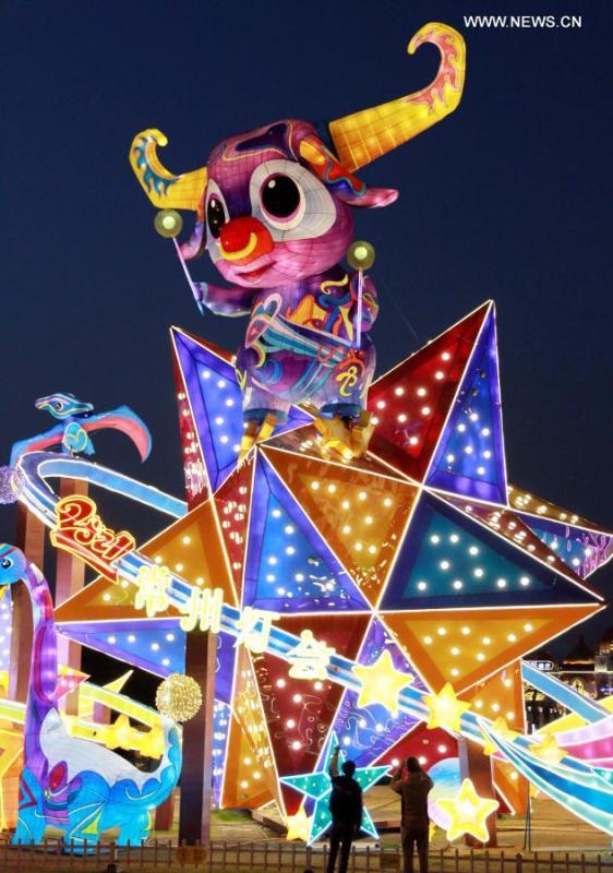 People view lanterns during a lantern show for the upcoming Chinese lantern festival, which falls on Feb. 26 this year, in Changzhou, east China's Jiangsu Province, Feb. 24, 2021. (Photo by Wang Qiming/Xinhua)