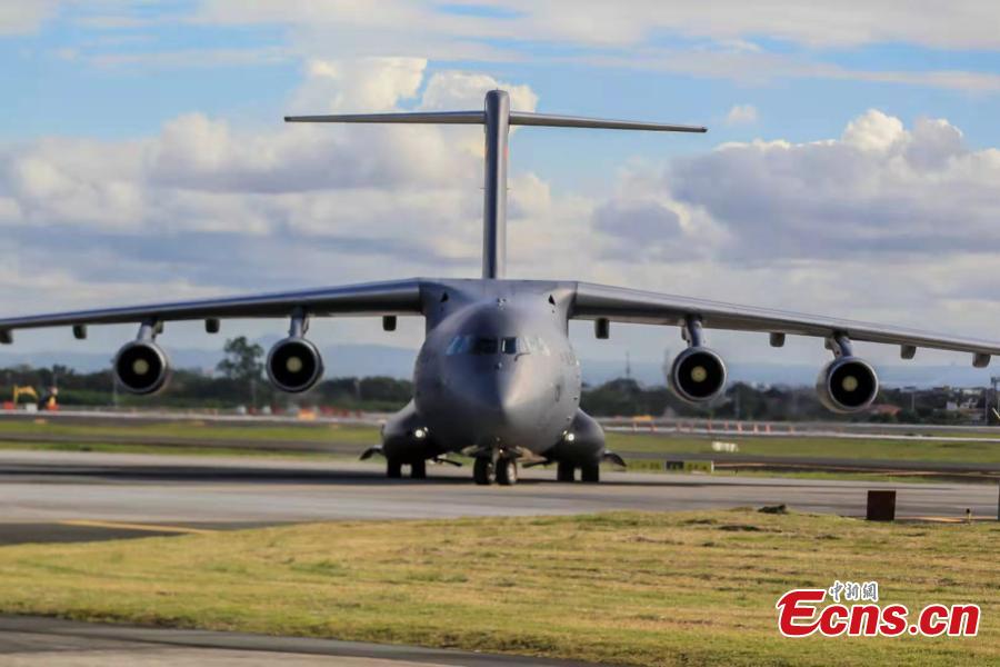 The Chinese military aircraft containing boxes of Sinovac vaccines, the first shipment of COVID-19 vaccines, arrives at Villamor Air Base in Pasay, Metro Manila, Philippines, Feb. 28, 2021. (Photo provided to China News Service)