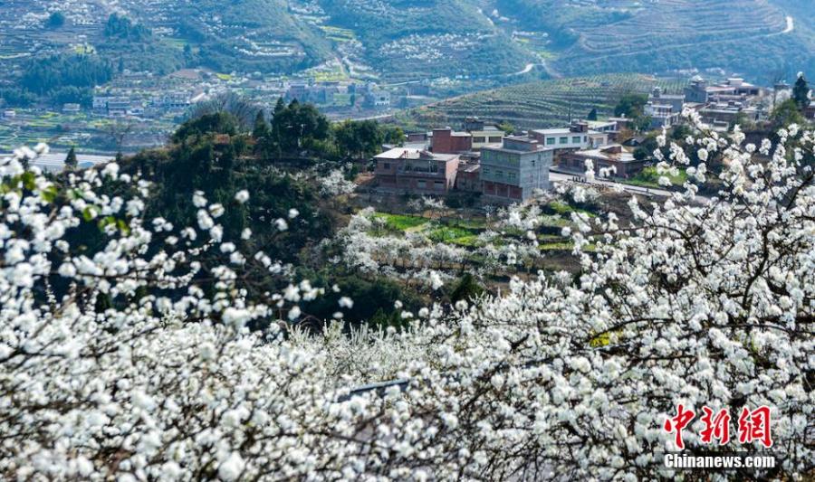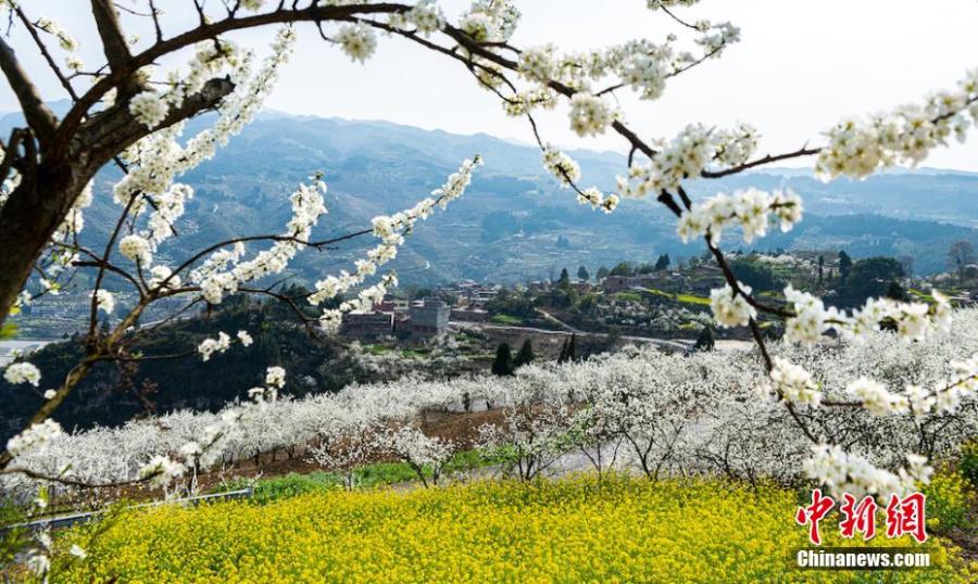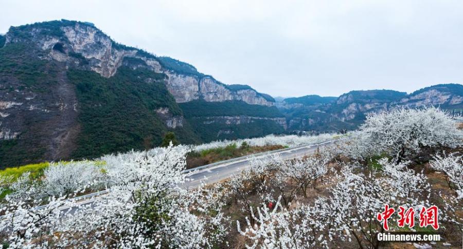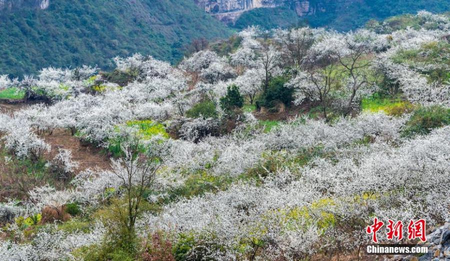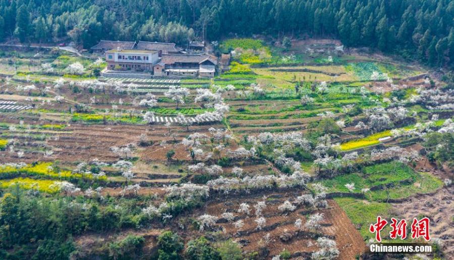 Aerial photo taken on March 1, 2021, shows sea of peach and plum blossoms in Xuyong County, Luzhou City, southwest China's Sichuan Province. Different spring flowers present a display of colors. (Photo/China News Service)