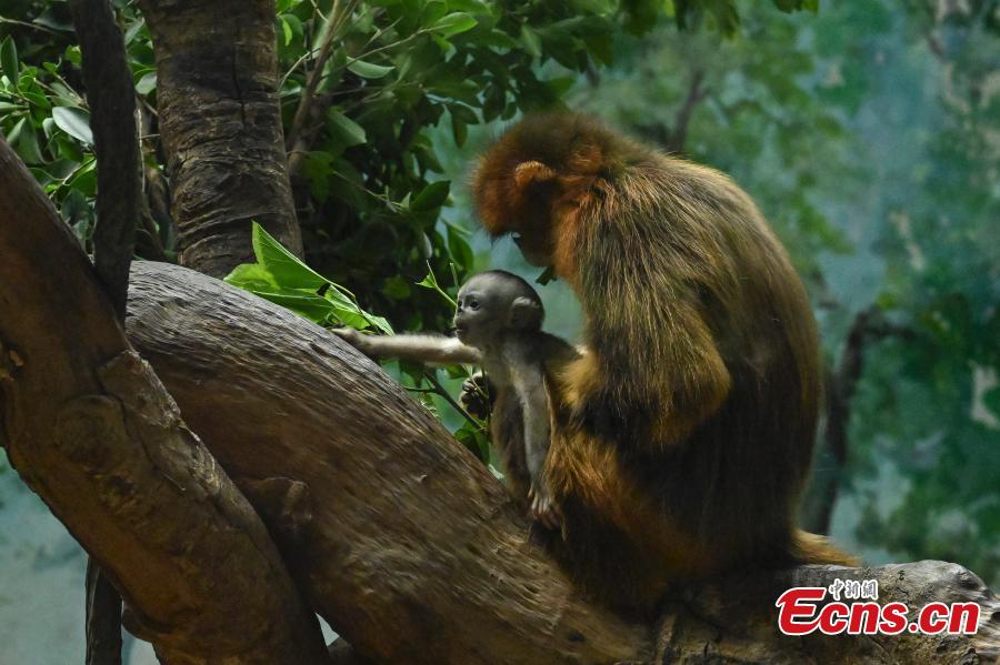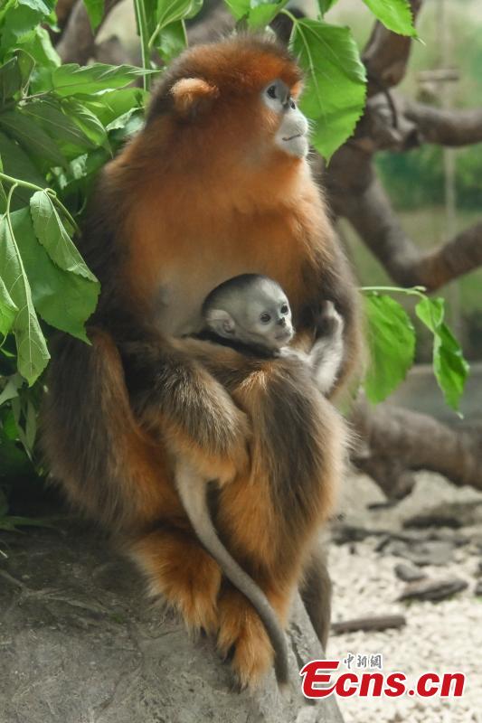 The golden snub-nosed monkey "Diandian" holds its baby in Guangzhou Chimelong Safari Park, Guangdong, March 3, 2021. (Photo: China News Service/Chen Jimin)