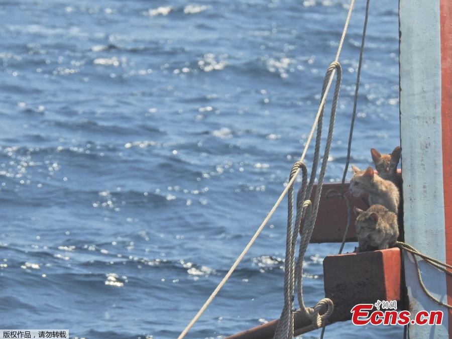 Cats look out from a sinking boat in the Andaman Sea on March 2, 2021. (Photo/Agencies)