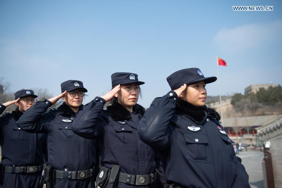 Members of the female police force of Badaling Police Station are seen at the Badaling Great Wall in Beijing, capital of China, March 7, 2021. (Xinhua/Chen Zhonghao)