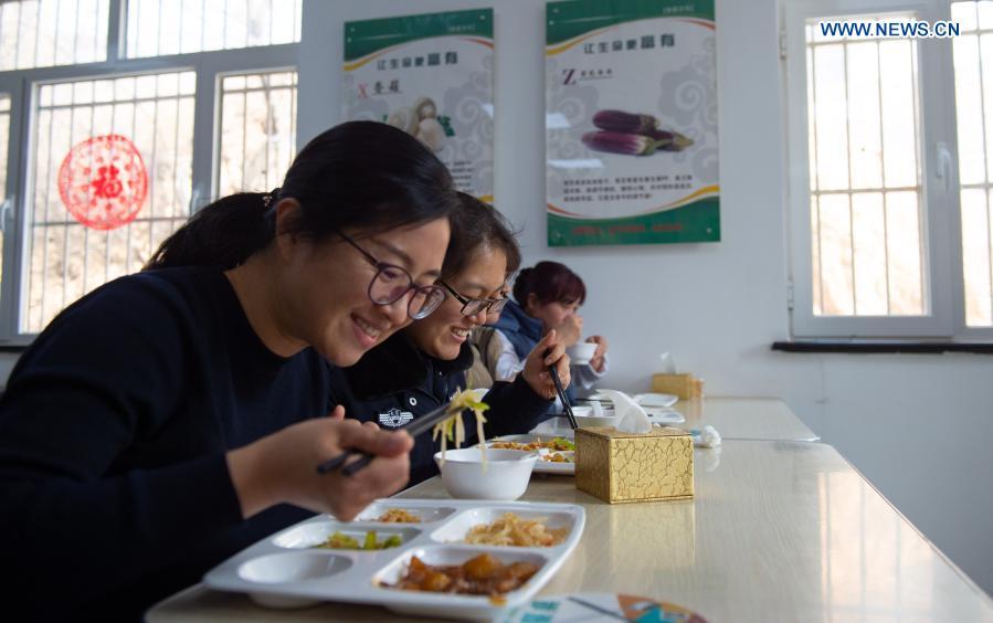 Members of the female police force of Badaling Police Station have lunch at a canteen in Beijing, capital of China, March 7, 2021. (Xinhua/Chen Zhonghao)