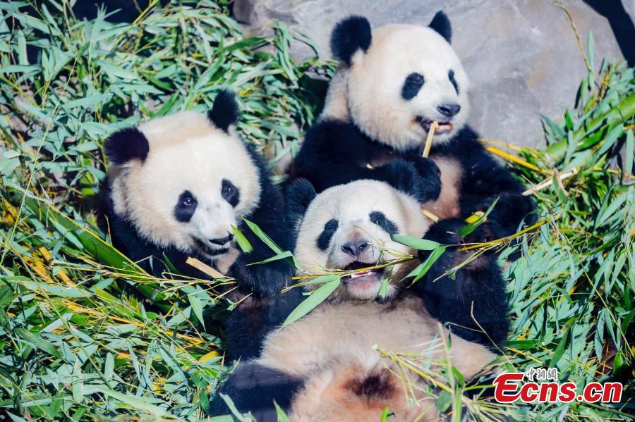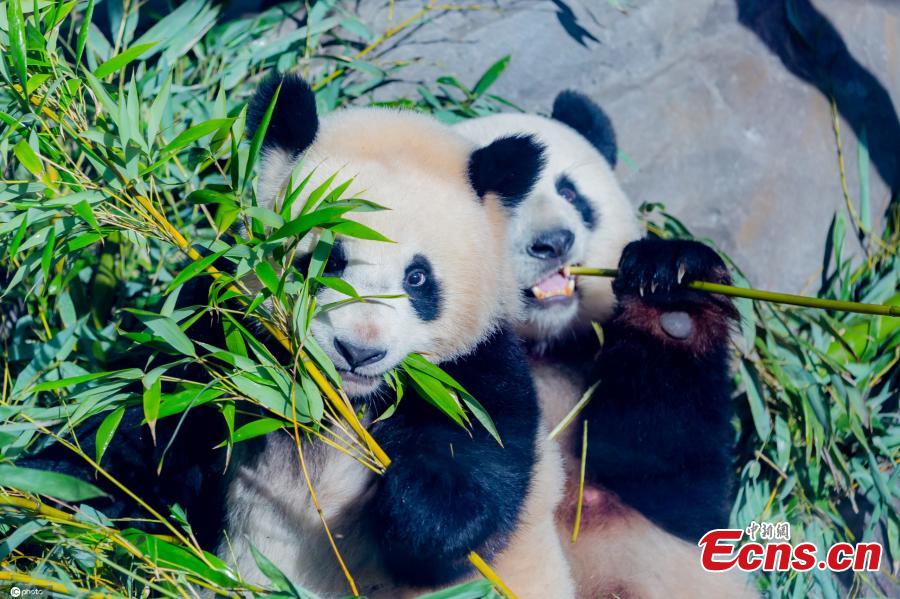 Twin panda cubs Meng Xiang (long-awaited dream) and Meng Yuan (dream come true) munch on bamboo at the Berlin Zoo, March 10, 2021. The twins were born on Aug 31, 2019 to giant panda Meng Meng, who has lived in Berlin Zoo since summer 2017. (Photo/China News Service)