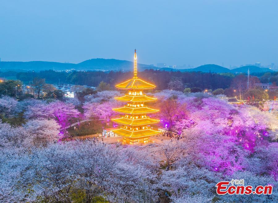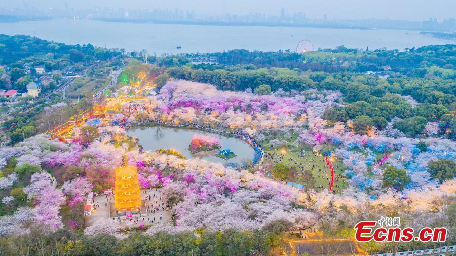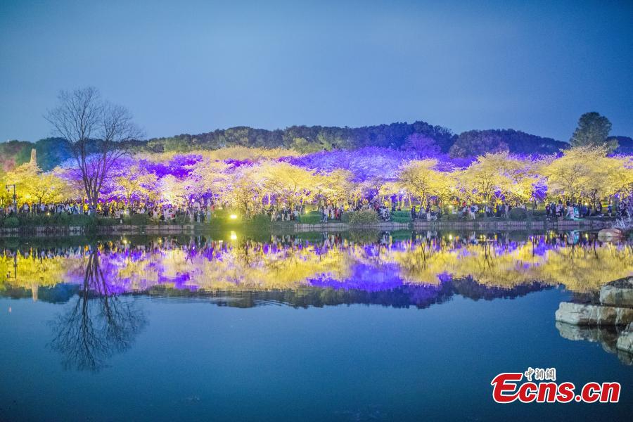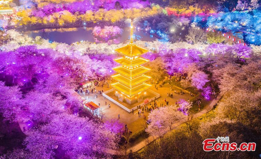 Photo taken on March 14, 2021 shows the East Lake Cherry Garden in Wuhan, capital of central China's Hubei Province. The number of visitors to the East Lake Cherry Garden has increased dramatically. In the evening, the blooming cherry blossoms are dazzling under the night light, making tourists feel wandering in a fantasy world. (Photo: China News Service/Zhao Guangliang)