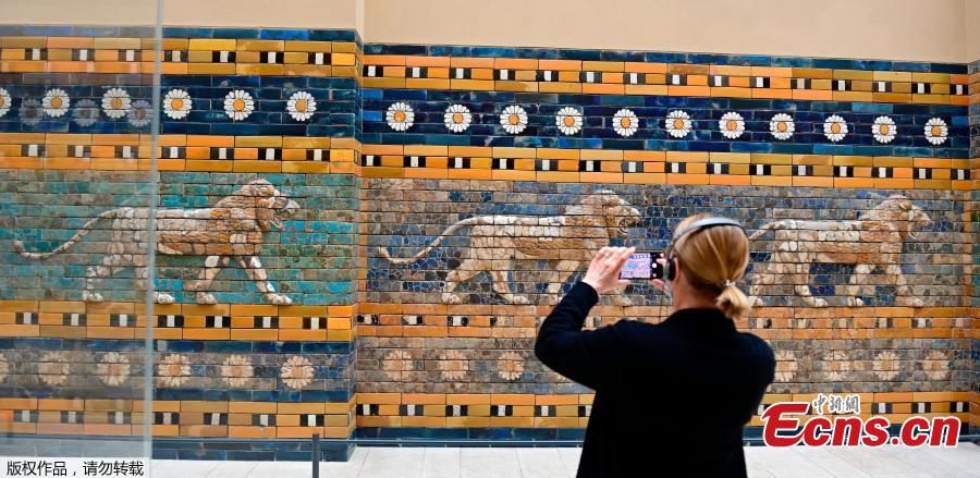 A visitor photographs a detail from the Processional Way of Babylon at the Pergamon Museum, Berlin, Germany, March 16, 2021. Visits at some state museums were possible again amid the COVID-19 pandemic. (Photo/Agencies)