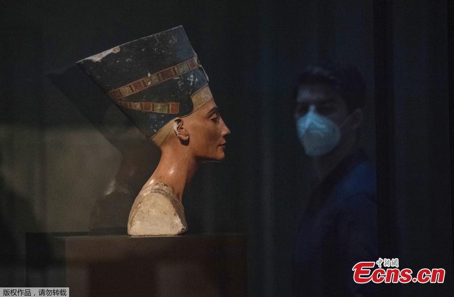 Visitors stand in an exhibition hall at Neues Museum Berlin, Germany, March 16, 2021. Visits at some state museums were possible again amid the COVID-19 pandemic. (Photo/Agencies)