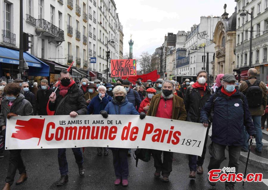French people hold a parade in Paris to mark the 150th anniversary of the founding of Paris Commune on March 18, 2021. (Photo: China News Service/ Li Yang)