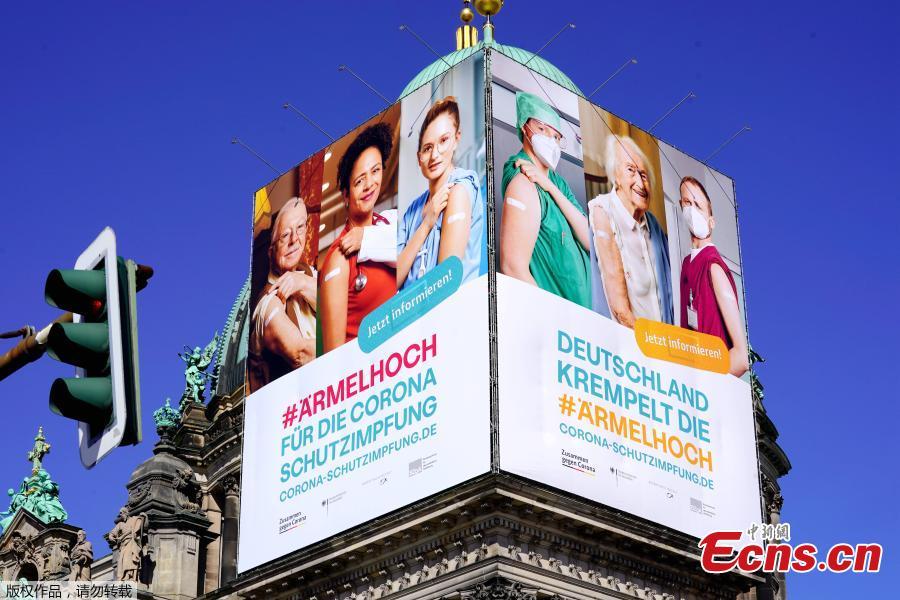 A digital billboard with a coronavirus health notice is seen on the building of Berlin Cathedral, Berlin, Germany, March 22, 2021. Germany announced to extend its current lockdown through to April 18 to curb the third wave of COVID-19 when coronavirus variants are spreading. An even stricter lockdown will be imposed across the country from April 1 to April 5, over the Easter holiday period. (Photo: China News Service/Peng Dawei)