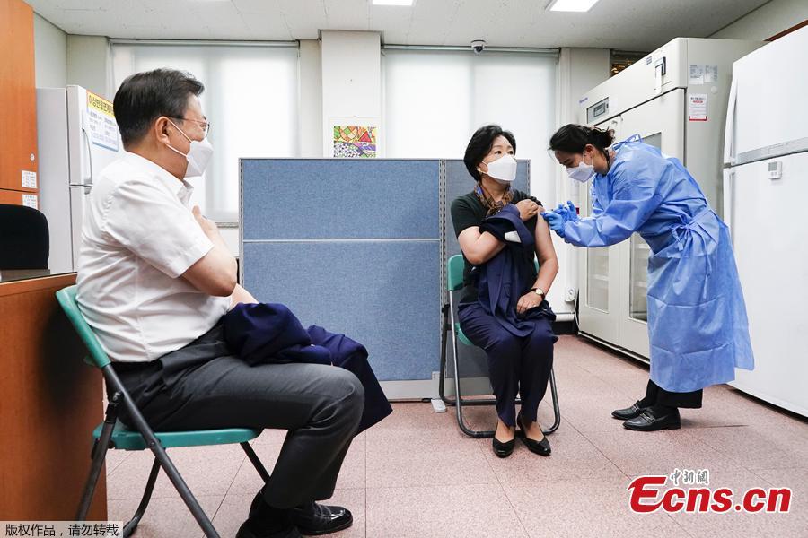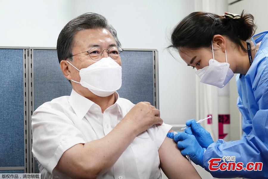 South Korean President Moon Jae-in receives his first dose of the COVID-19 vaccine at a public health center in central Seoul, March 23, 2021. Moon and his wife were given the first jab of AstraZeneca's coronavirus vaccine on Tuesday ahead of his overseas trip. South Korea began inoculating more senior citizens and health workers on Tuesday in an effort to accelerate its vaccination drive.(Photo/Courtesy of South Korea's presidential Blue House)