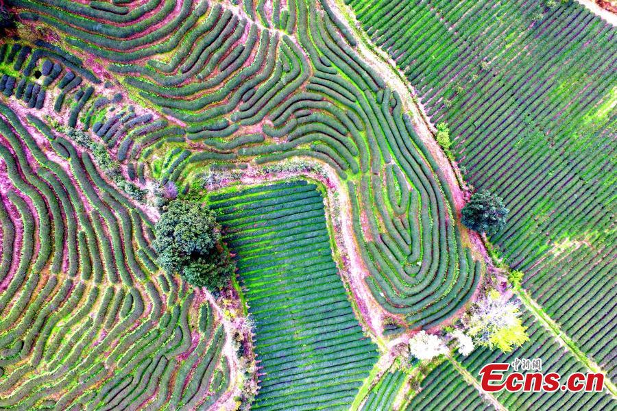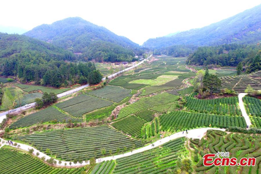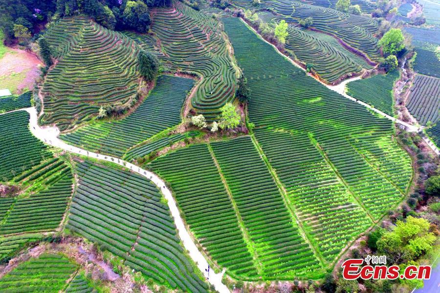 Aerial photos show the Yanzichao tea garden at the foot of Mount Wuyi, SE China’s Fujian Province. The ecological tea plantation mainly produces high-quality Wuyi Rock tea, which uses green manure like Soybeans and canola. The plantation covers an area of more than 30,000 mu (20 sq km). (China News Service/Wang Dongming)