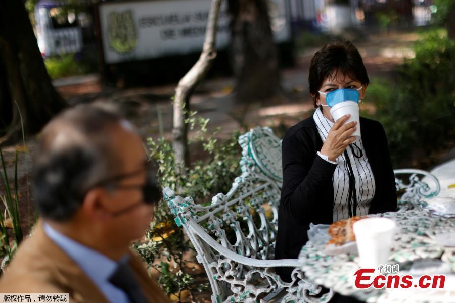 A Mexican woman/man wears a nasal mask while eating and drinking. Researchers in Mexico have designed a new mask that can only cover peoples’ noses, a way no only to reduce transmission of COVID-19 but also allow people to chow down outdoors, which spurs discussions online. (Photo/Agencies)