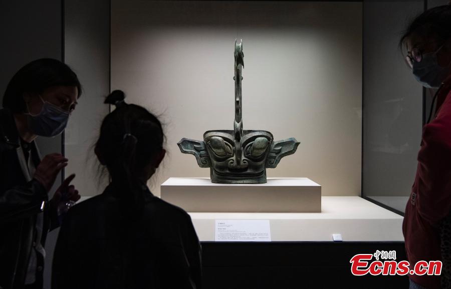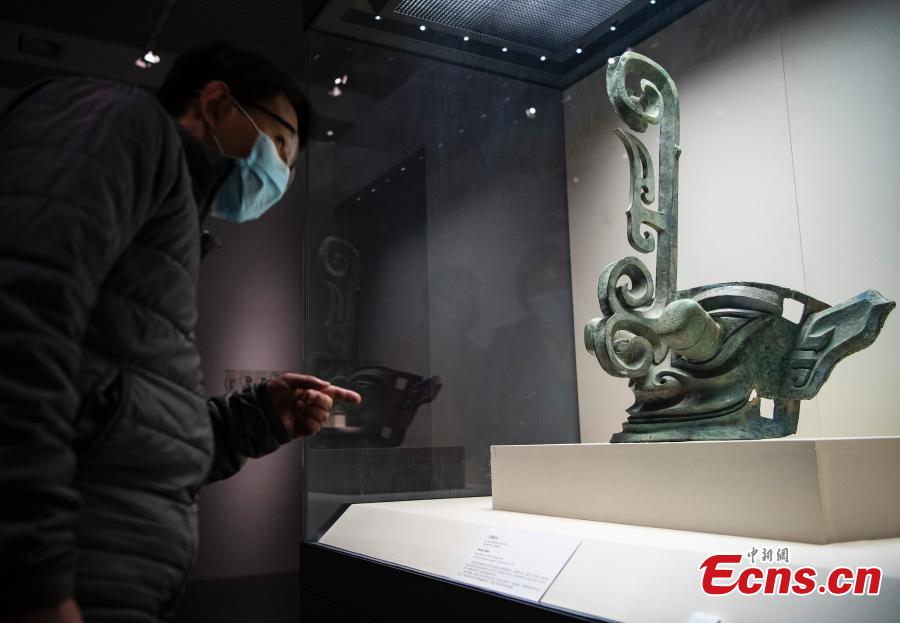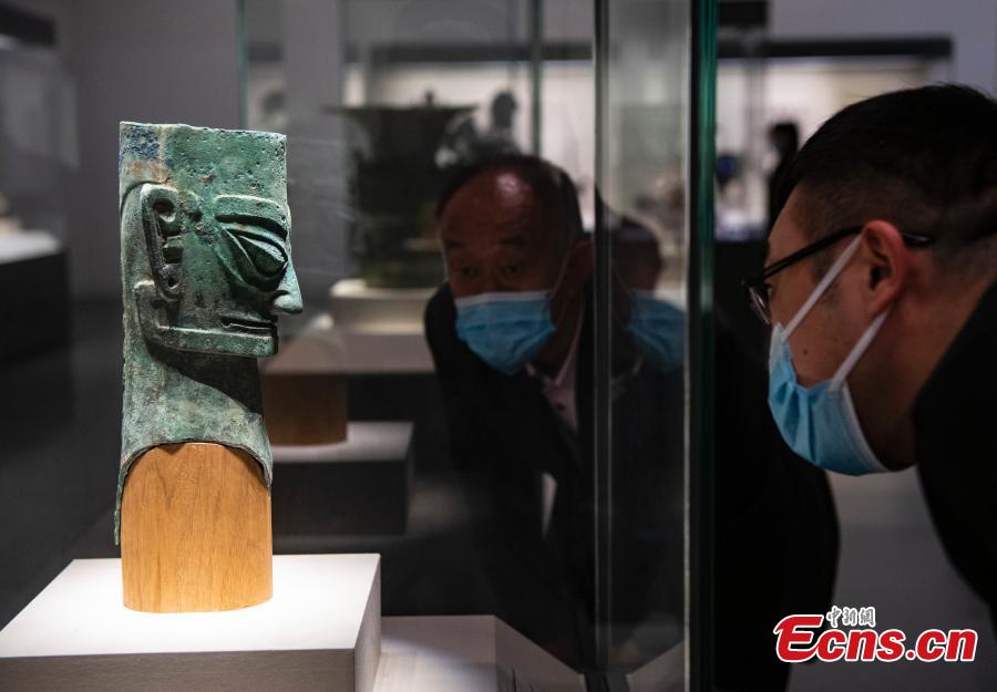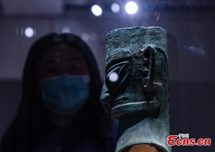 Visitor looks at a bronze mask unearthed from the Sanxingdui Ruins at the National Museum of China in Beijing, March 26, 2021. The shock of hundreds of more than 3,000-year-old cultural relics newly excavated from the Sanxingdui Ruins site in SW China’s Sichuan continues across China. Some stunning discoveries from the Sanxingdui Ruins preserved at the National Museum of China has drawn a number of visitors. (Photo: China News Service/Hou Yu)