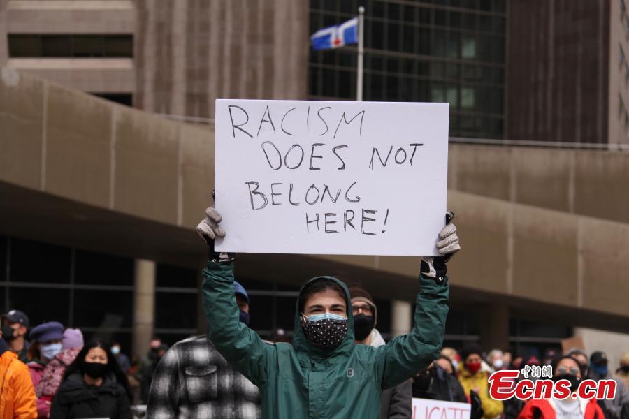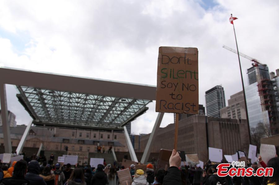 Toronto residents hold anti-racism signs during a rally in front of City Hall in Toronto, Canada, March 28, 2021. Thousands of people from different ethnic communities attended the rally to call for an end to Asian-hatred. On the same day, the "Stop Asian Hate" rallies were held in Toronto, Vancouver, Calgary, Ottawa and other Canadian cities. (Photo: China News Service/Yu Ruidong)